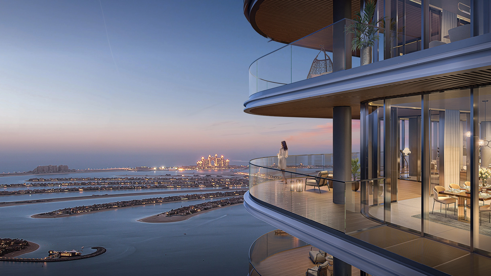 الشقق: تتراوح ما بين غرفة نوم واحدة إلى أربع غرف نوم، ومؤثثة بالكامل بتصاميم رحبة ومفتوحة، ونوافذ ممتدة من الأرض حتى السقف، وتشطيبات فاخرة. يتمتع السكان بإطلالات بانورامية على الخليج العربي، ونخلة جميرا، ودبي مارينا، حيث صُممت كل وحدة لتعكس الأناقة الخالدة والانسيابية المثالية بين المساحات المعيشية. تحتوي العديد من الشقق على غرف غسيل، وشرفات، وفي الوحدات الأكبر، غرف خاصة للخادمات.