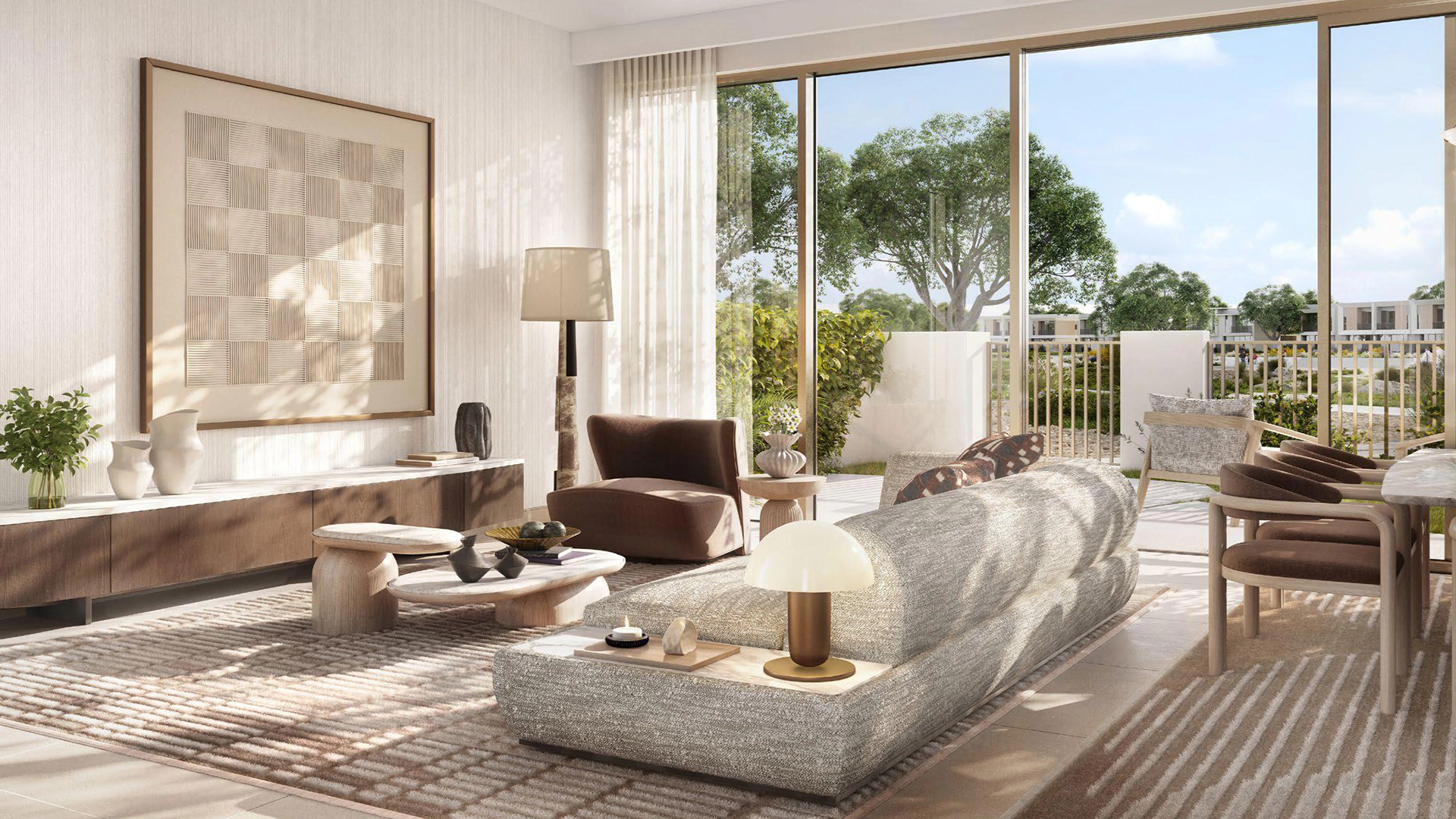 مساحات معيشة مفتوحة بخامات فاخرة ولوحة ألوان هادئة ومحايدة